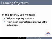 Outline: What is prompting Importance of clarity in a prompt Vague and clear Prompts Analogy: Child and instructions Steps for a good prompt Examples of structured prompting Benefits of pro..
